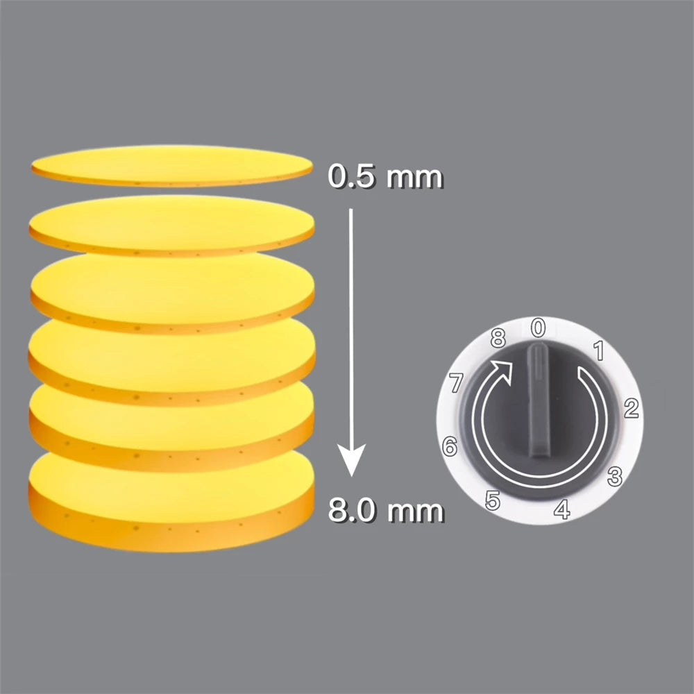 [Multifuncional] Las cuchillas permiten flexibilidad para cortar, rebanar, triturar, picar fácilmente frutas y verduras en diferentes formas y tamaños. Como una patata, puedes hacerla en rodajas normales o en zigzag, tiras o triturarla fácilmente.