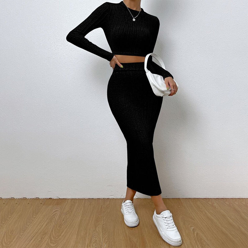 CHIC CROP & MIDI DESIGN - This modern pairing features a long-sleeve crop top and a high-waisted midi skirt, a trendy combination that elegantly highlights the waistline for a balanced and fashionable look.