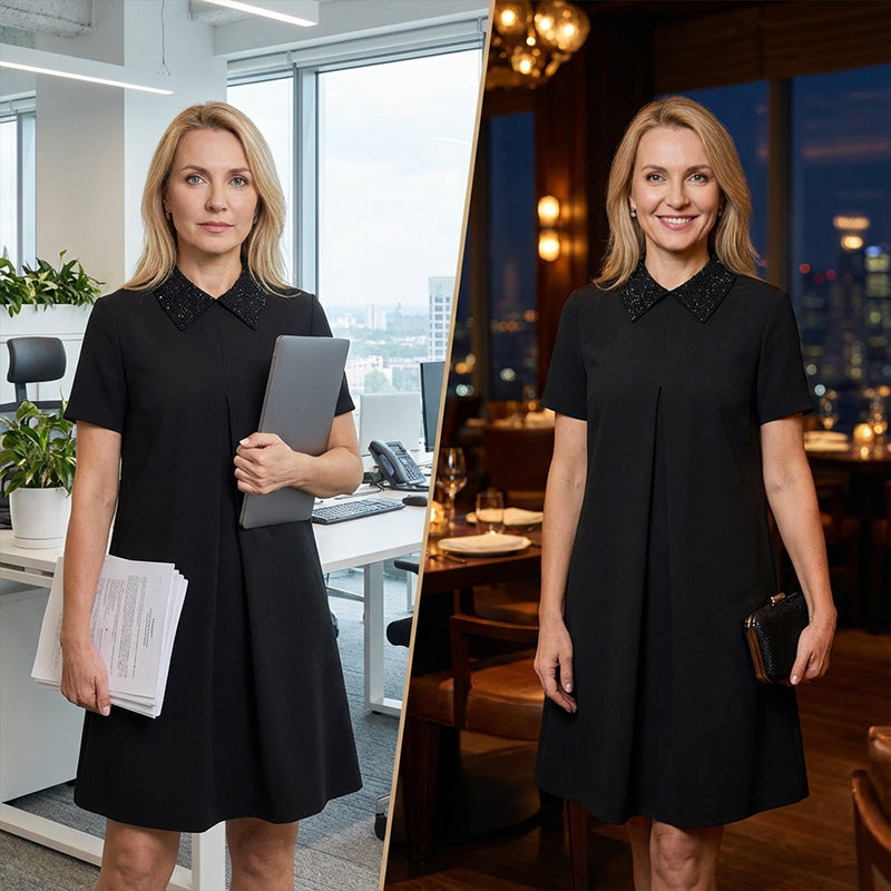 ELEGANT COLLAR - Adds a sophisticated sparkle that frames your face beautifully. This built-in accessory elevates the entire look, allowing you to transition effortlessly from a professional setting to an evening out without needing extra jewelry.